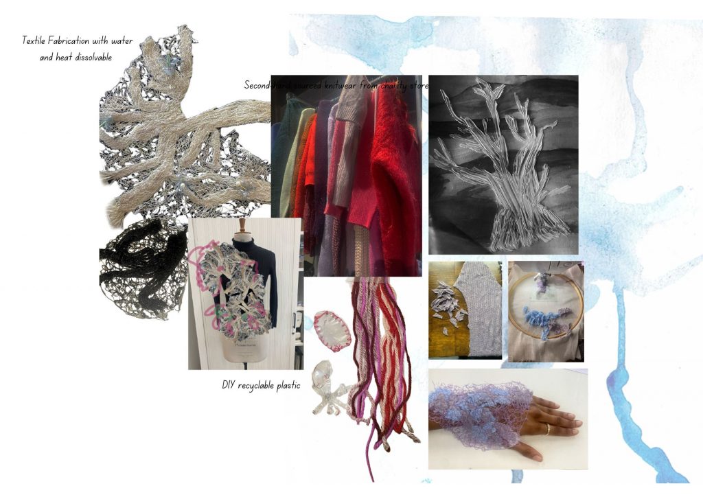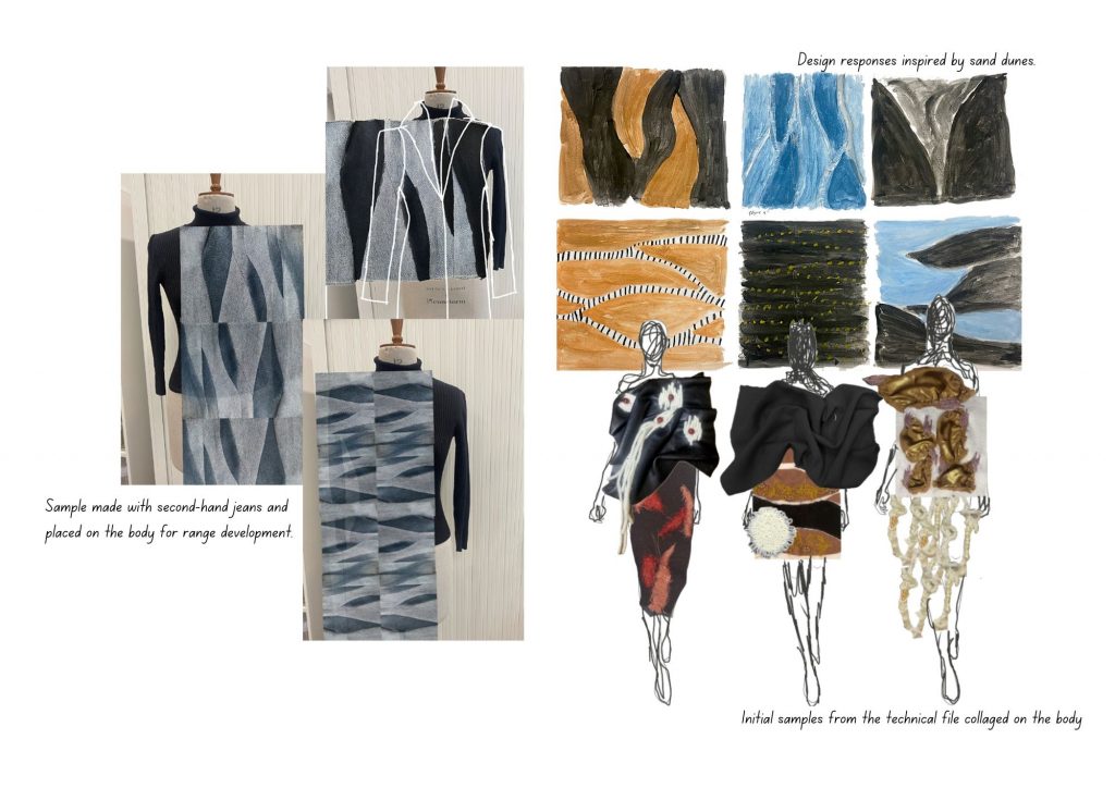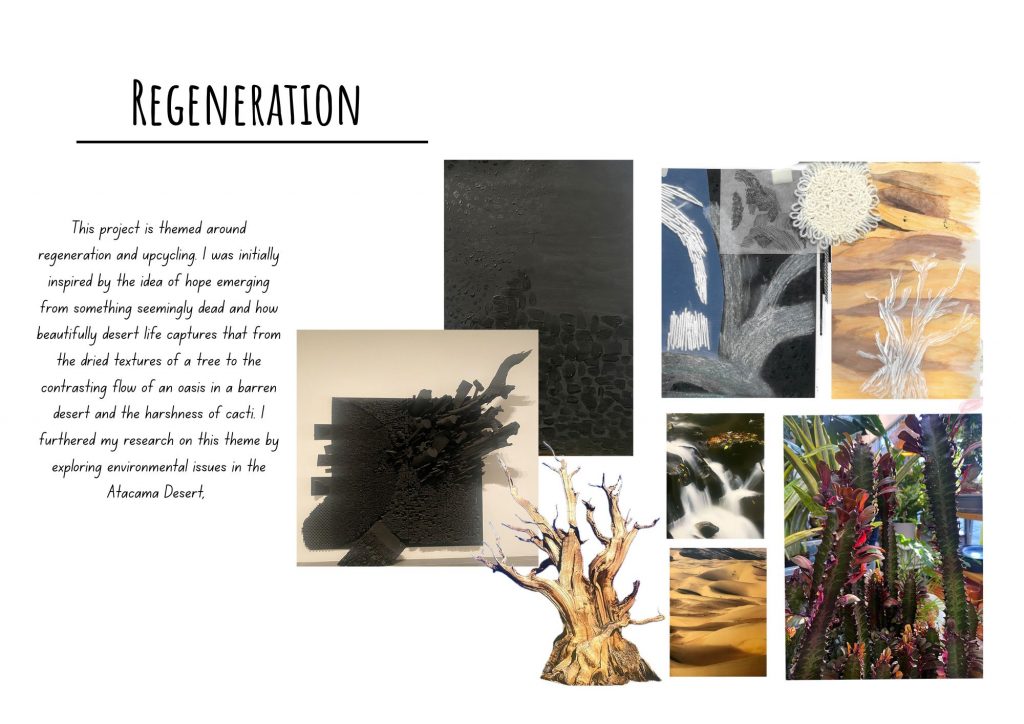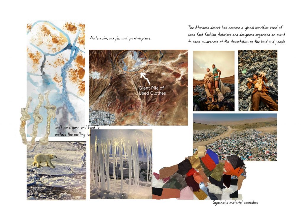 My project is themed around regeneration and upcycling. I was initially inspired by the idea of hope emerging from something seemingly dead and how beautifully desert life captures that from the dried textures of a tree to the contrasting flow of an oasis in a barren desert and the harshness of cacti. I furthered my research on this theme by exploring environmental issues in the Atacama Desert, where tons of clothes are dumped, contributing to the current global waste crisis. I also examined the global effects of climate change in the Arctic. Both the visuals from the Arctic and desert inspired my design responses, leading me to explore different techniques to translate those elements onto fabric using mostly second hand materials
