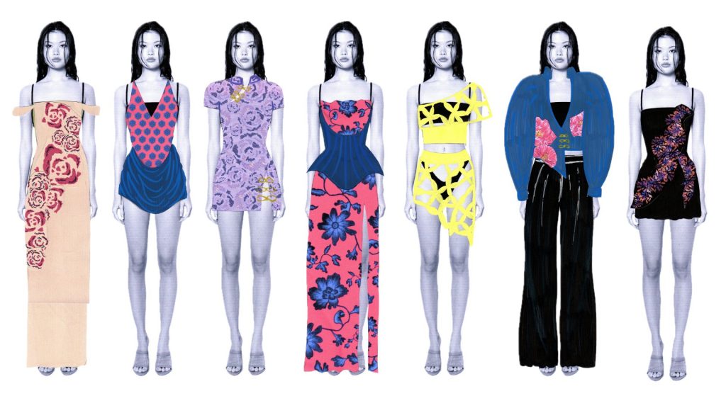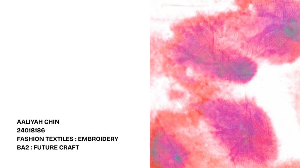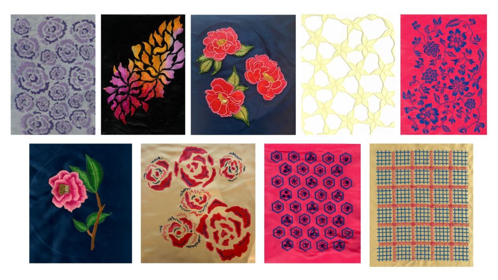For this project, my chosen stitch was Chinese silk embroidery, which led me to look into chinoiserie patterns and vases. Florals were a common motif in this project due to their relation to China and chinoiserie, specifically the peony, in which I explored a range of different techniques such as appliqué, beading, silk shading and free-hand machine embroidery. For my colour palette, I chose the trend 'pulsepoint', which consists of a lot of vibrant, warm-toned colours with some darker tones. The main colours in my project were dark blue, bright pink and yellow, with hints of purple and gold.