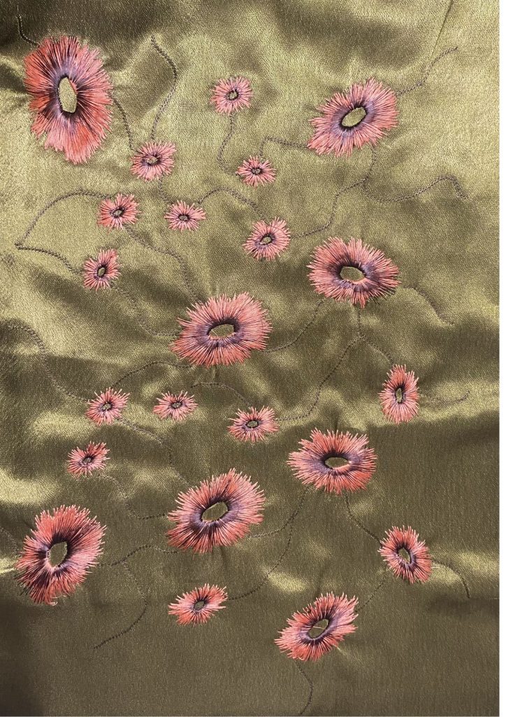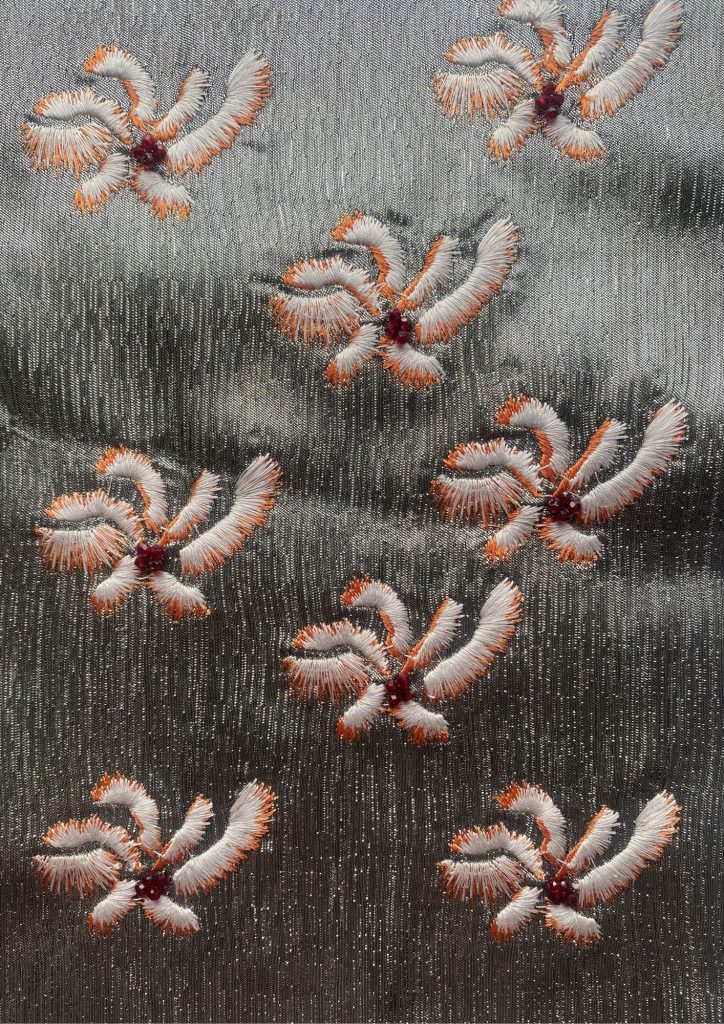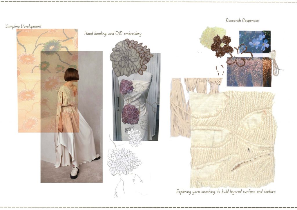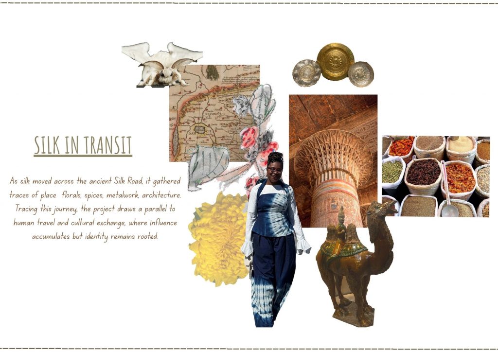 Researching key Silk Road regions China, Mongolia, Persia, Egypt, and Europe I explored trade as not only the exchange of goods, but of symbols, techniques, and style .As silk travelled, it absorbed local visual languages florals, spices, silverware, ornamentation, architecture becoming richer through cultural contact. The project parallels this journey with human movement: migration and exchange influence expression without erasing origin. Inspired by a globally travelled woman grounded in Nigerian identity, the consumer profile reflects cultural hybridity as layered influence. Through textile sampling and layered surface development, the work explores how fabric can hold memory, movement, and the quiet evidence of travel.